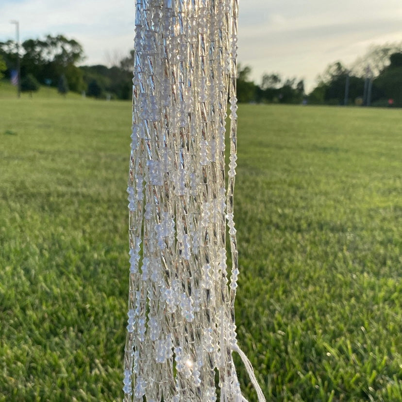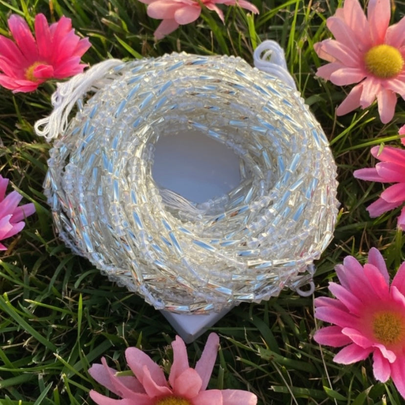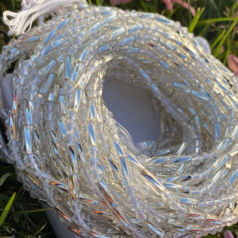 All glass crystal waist-bead. Crafted using all clear crystal and silver bugle beads.