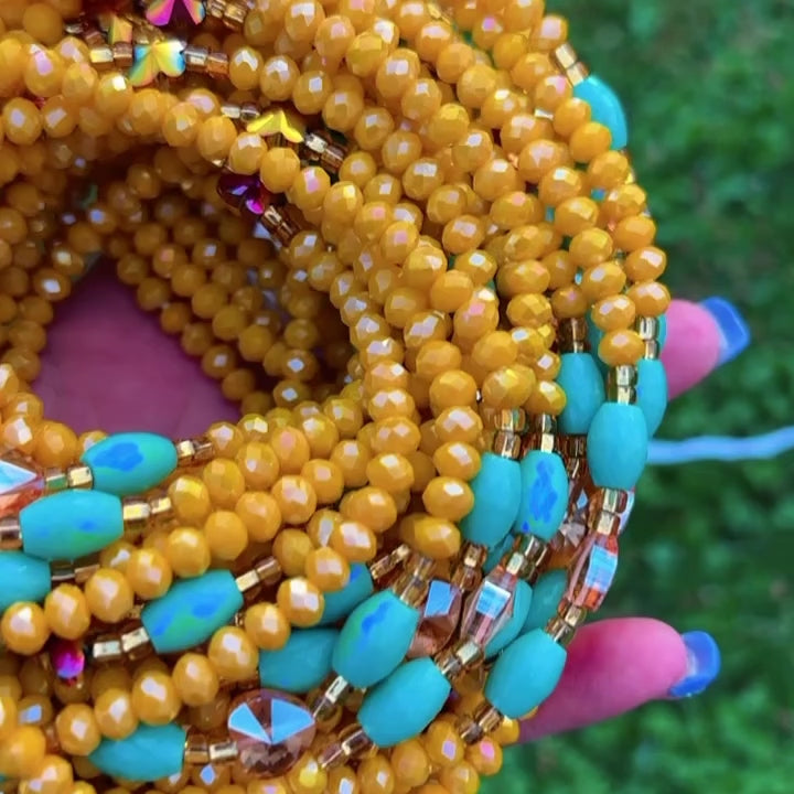 Crafted using Yellow, Turquoise, and Iridescent GoldĀ Colored Crystal Beads.